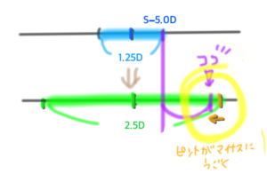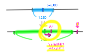 S面の位置を大きめ(プラスより)に動かしたいときは、考える乱視を大きめにします。