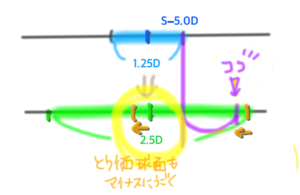 この場合だとS面を-0.25Dか-0.5D動かすことになります。