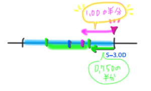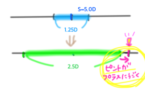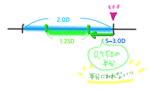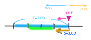 S-3.0Dにある後ろのピントを、左(マイナス方向)に0.25D動かせばS-3.25Dに、0.5D動かすとS-3.5Dになります。