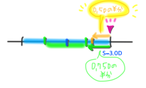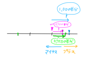 0.5Dと考えると、赤の位置に動く幅は少なくなるので赤の位置になります。